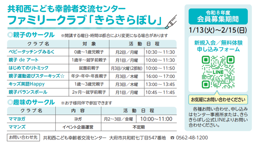共和西こども幸齢者交流センターで活動しているファミリークラブ「きらきらぼし」の親子サークルと趣味のサークルのご案内です。